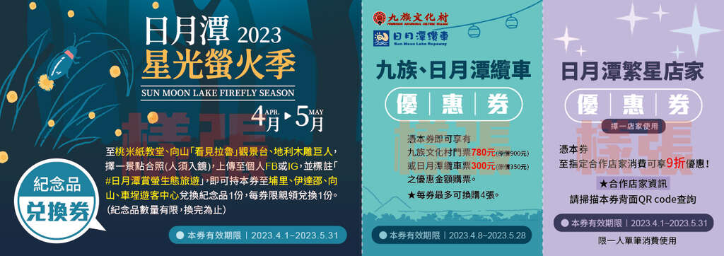 Sun Moon Lake Firefly Season Coupon include “Firefly Viewing Season Souvenir Voucher”, “Formosan Aboriginal Culture Village and Sun Moon Lake cable car discount coupon” and “Sun Moon Lake Star Shops Coupon”.