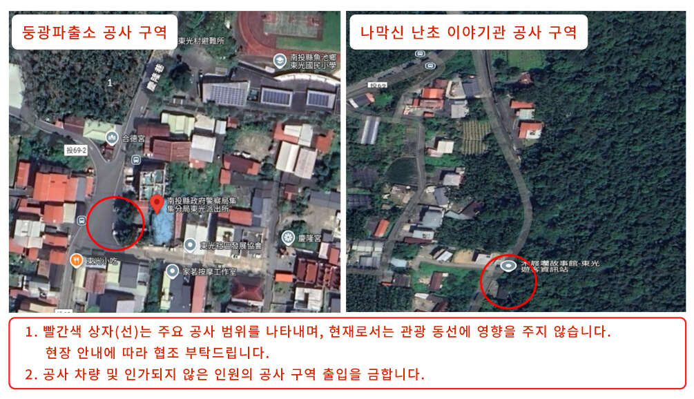 르웨탄 주유소는 설비 및 배관 개선 공사로 인해 2025년 5월 12일부터 영업을 잠정 중단합니다. 공사 기간은 약 6~8개월로 예상되며(빠르면 2025년 연말, 늦어도 2026년 2월 이후 완공될 예정) 공사 기간 중에는 인근의 위츠(魚池) 주유소나 수이리(水里) 주유소를 이용해 주시기 바랍니다. 이용에 불편을 드려 죄송합니다. - "터우서(頭社) 저수지 송수관로, 순찰로 및 저수지 주변 시설 개선 공사""가 진행됨에 따라 단계적으로 공원이 폐쇄되고 통제가 이루어질 예정입니다. 자세한 사항은 첨부된 그림을 참조하시기 바랍니다. 공사 기간 동안의 안전을 고려한 실제 개방 상황에 대해 궁금한 점이 있으시면, 농업부 농지수리청 난터우관리처 위츠작업소로 문의해 주시기 바랍니다. 전화번호: 049-2895541.