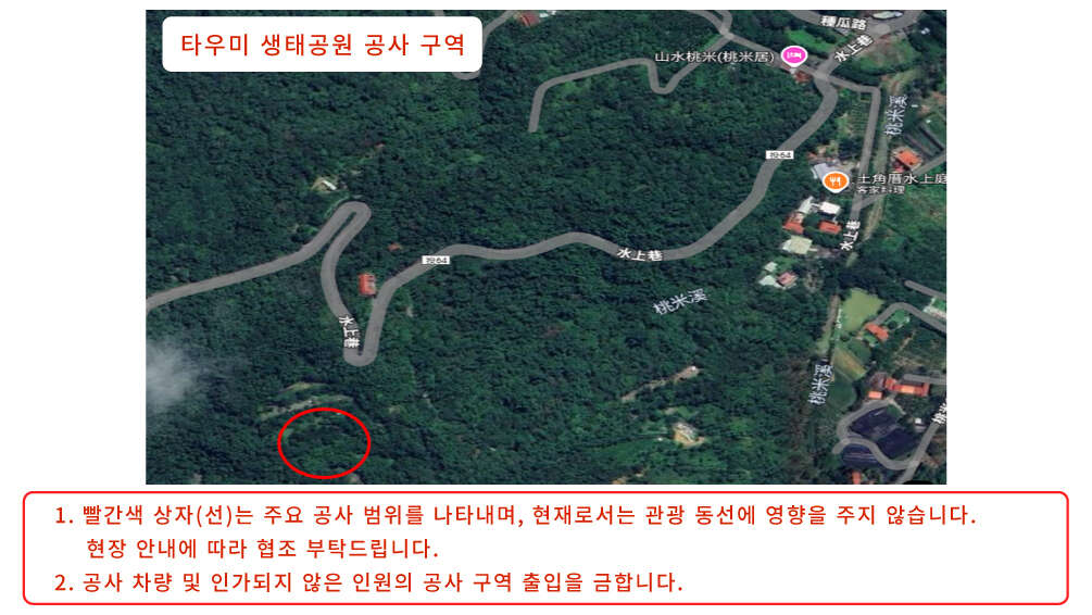 자오우(朝霧) 부두 근처 자전거 도로가 주요 공사 구간이며, 그림 이미지의 빨간색 표시 구역을 참고하시기 바랍니다. 현장 안내에 따라 주시고, 관광객은 공사 구역에 출입하지 마시기 바랍니다. 현장 표지판 및 안내 인원의 지시에 따라 통행해 주시기 바라며, 불편을 끼쳐 드려 죄송합니다.