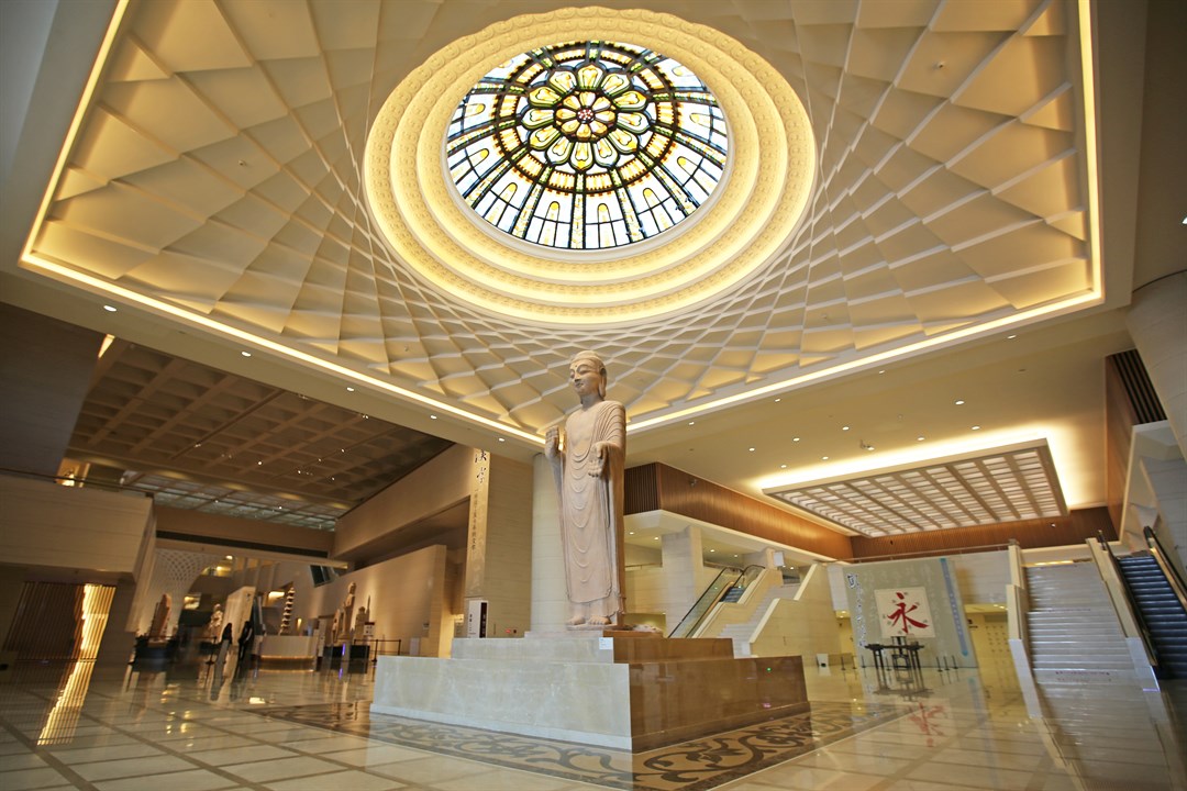 走進一樓挑高九米的大廳,彷佛進入清淨光明的佛法界。中央主佛上方的天花,以石窟穹頂方形旋轉的設計手法,呈現「十方三世」的佛教時空觀,當光線從中間蓮花圖案彩繪玻璃灑在環形羅列的三層化佛上,彷彿置身於諸佛菩薩海會雲來集的華藏世界中,引領參訪者由此進入佛教藝術的股堂。