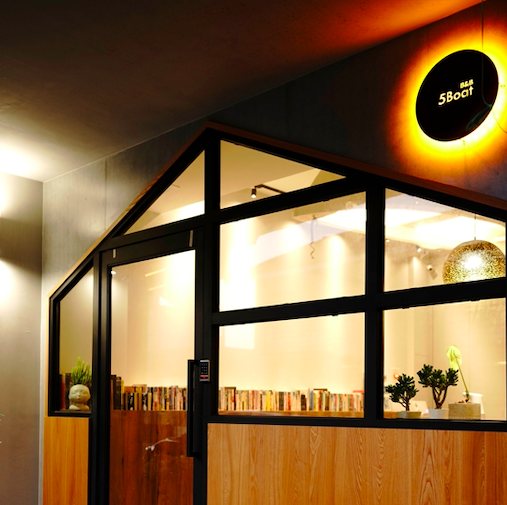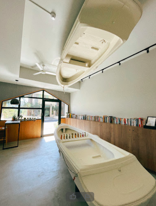 外牆上的手划船裝飾; 大廳上下倒影的手划船裝飾; 用餐區特意留下斑駁的手划船裝飾; 都是希望能再次喚起對日月潭的老印象。 故事和自然可以共存結合, 老房子內也能夠裝著年輕的設計靈魂。
