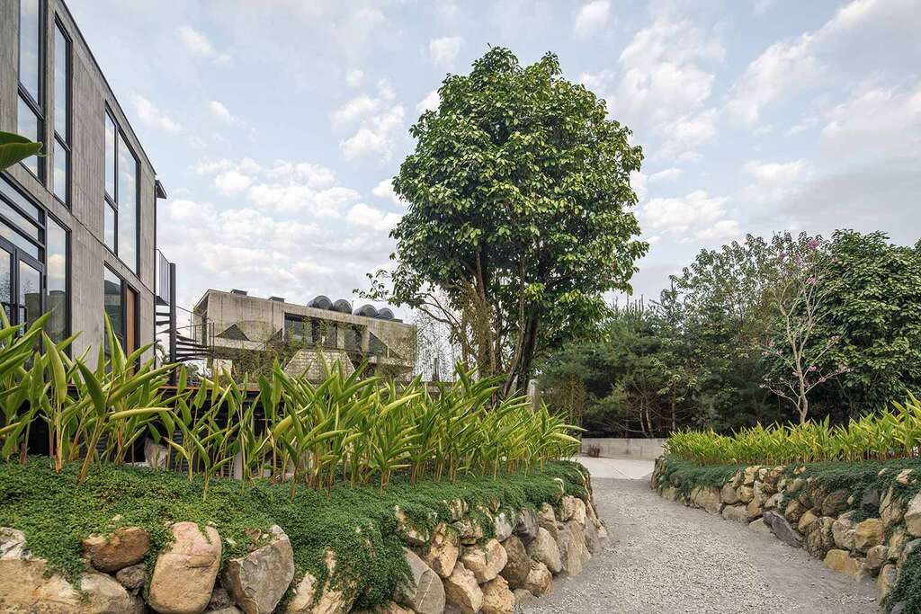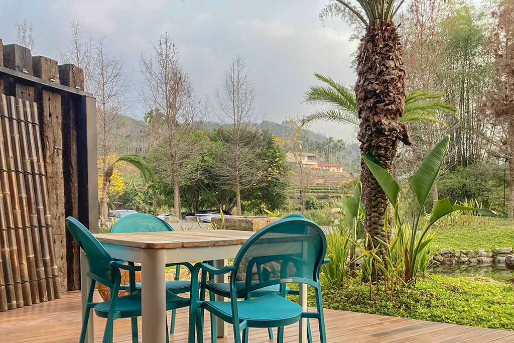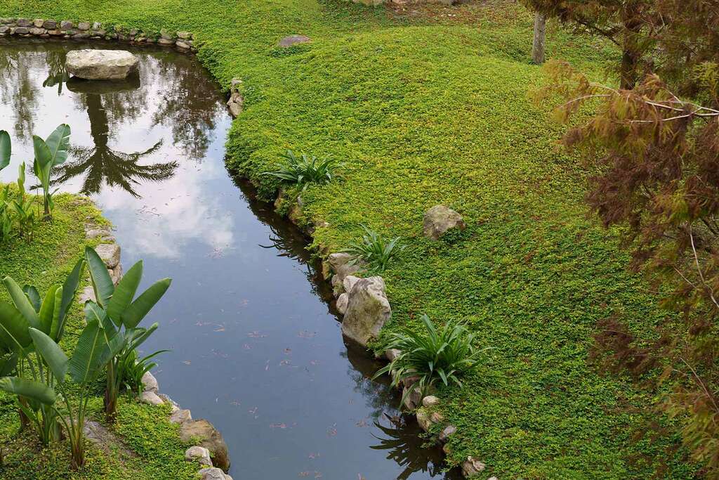 落羽河道的涓涓流水,為人工開鑿,是從河渠古道引水進來,成為遊獵行腳的一彎風景,以野意奔放的熱帶植栽,呈現雨林的原始蠻荒,汩汩水聲川流,鳥語蛙鳴伴和,自然播放療癒的背景音。
