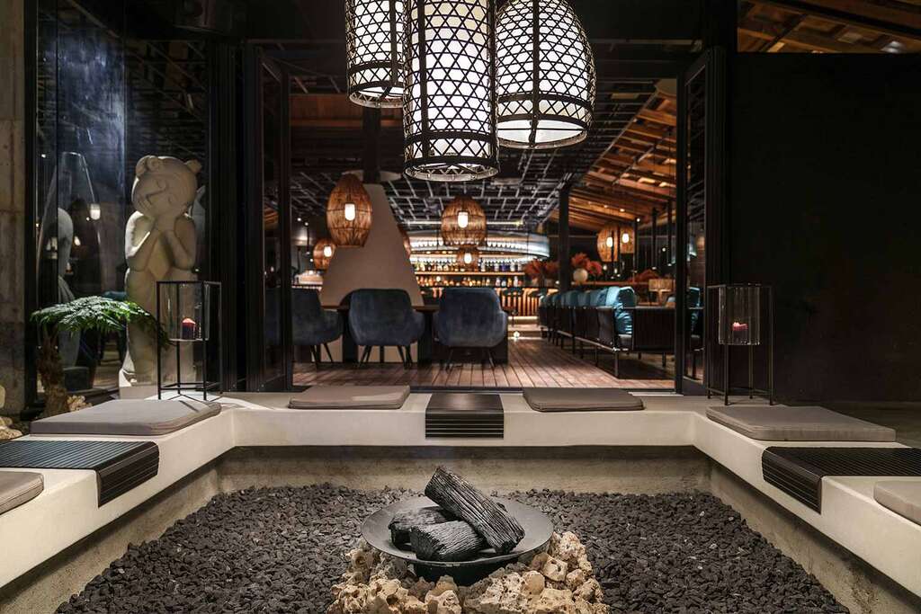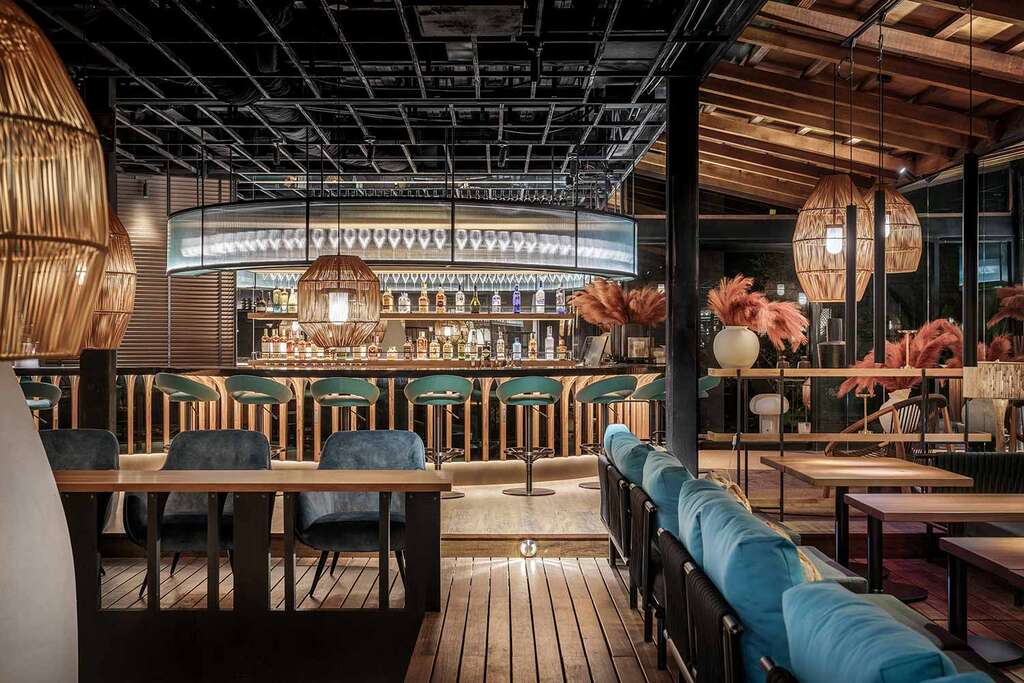 水的設計,以海棗流域的戲水池為中心,流淌大塊碧藍,映襯藍天白雲,創造水池聚會的大舞台,人們能夠匯聚與交流,溫水與冷水分池,80公分的高度,讓旅人剛好可以露出上半身,展現身體線條與泳裝造型,成為整座主場的目光焦點。