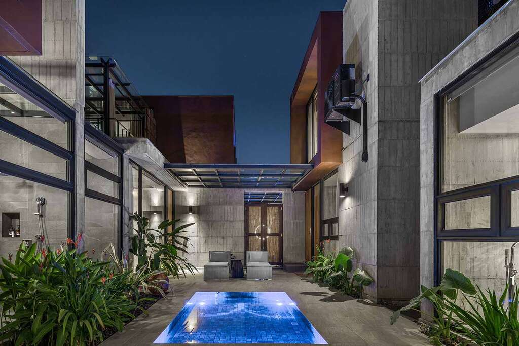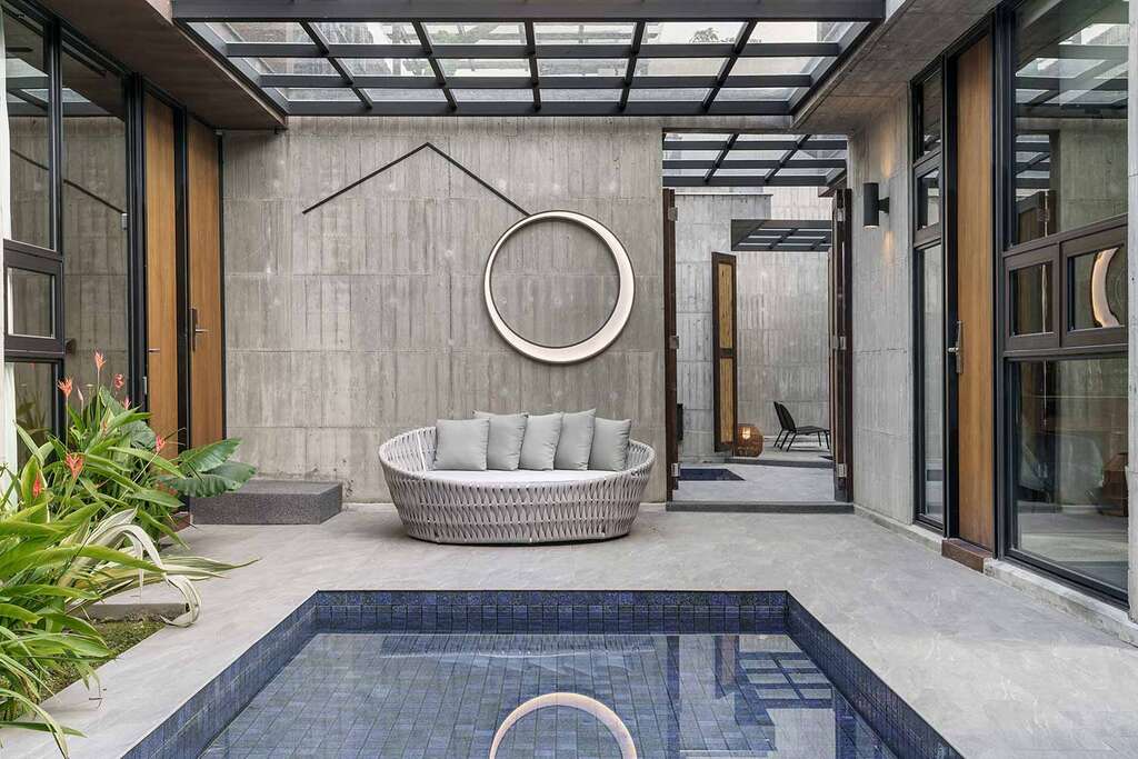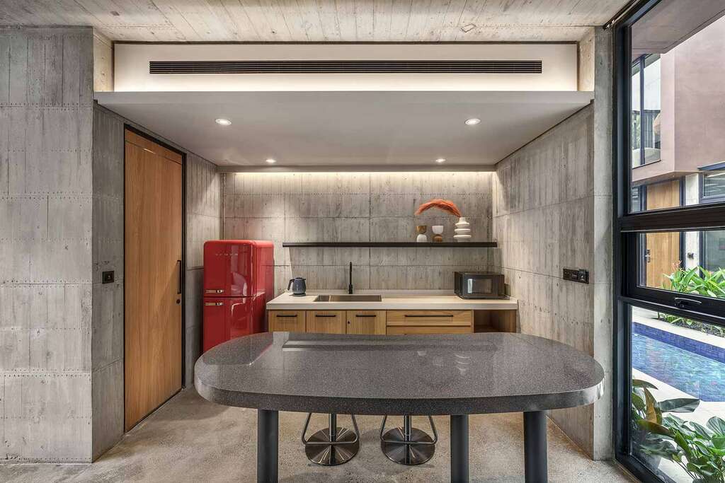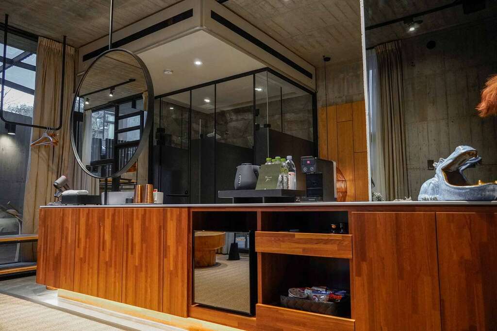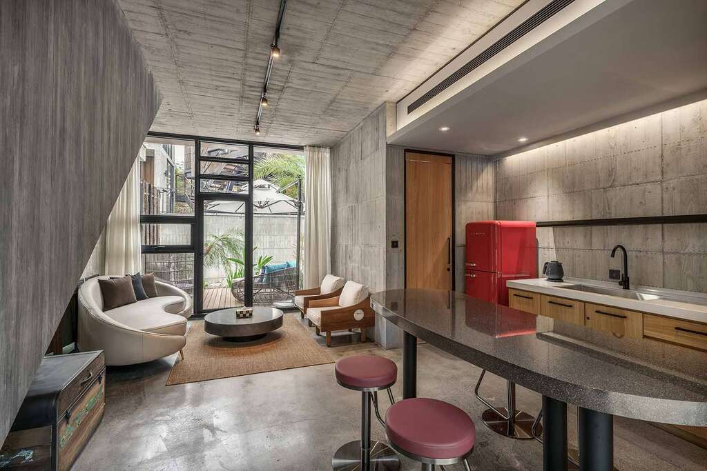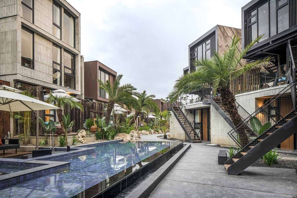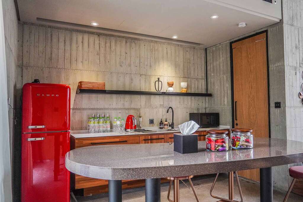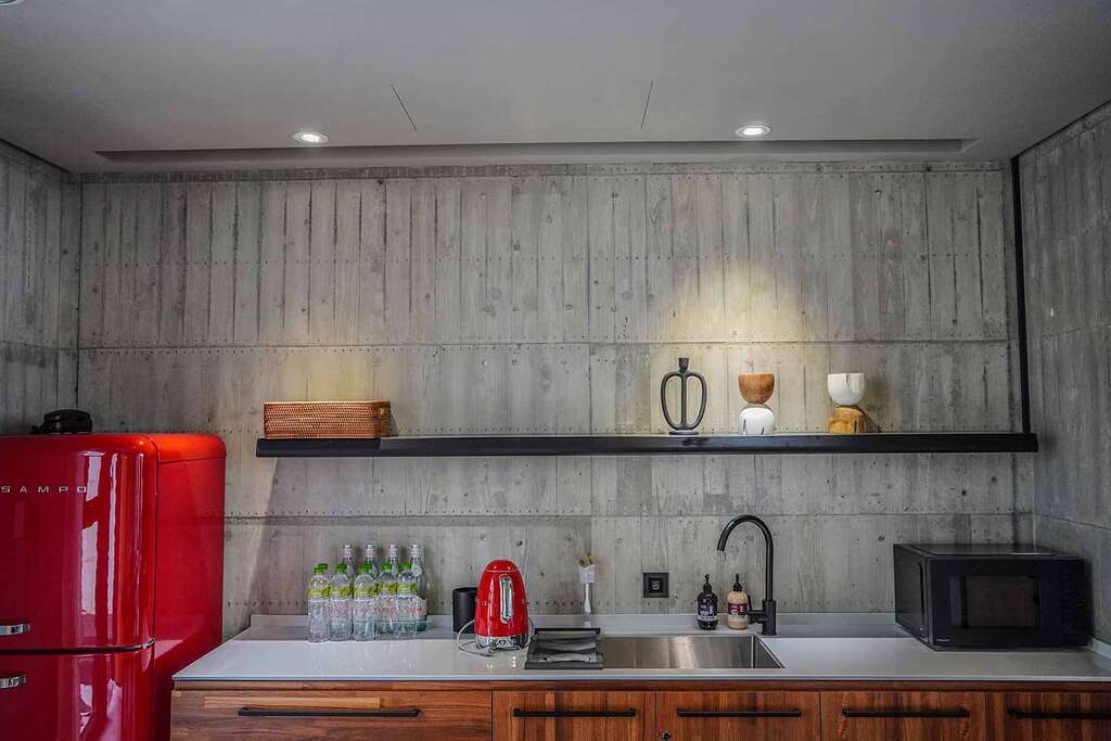 水的創意延伸至馬賽屋的共院,包區的旅人形成聚落,圍繞水池,隨性散坐,水池特別設計40公分高,營造無壓力的輕鬆感,靜水如鏡,能夠洗滌煩憂,拉近人們的距離,彼此聊天說笑,在天光與星空下,收藏相聚回憶。