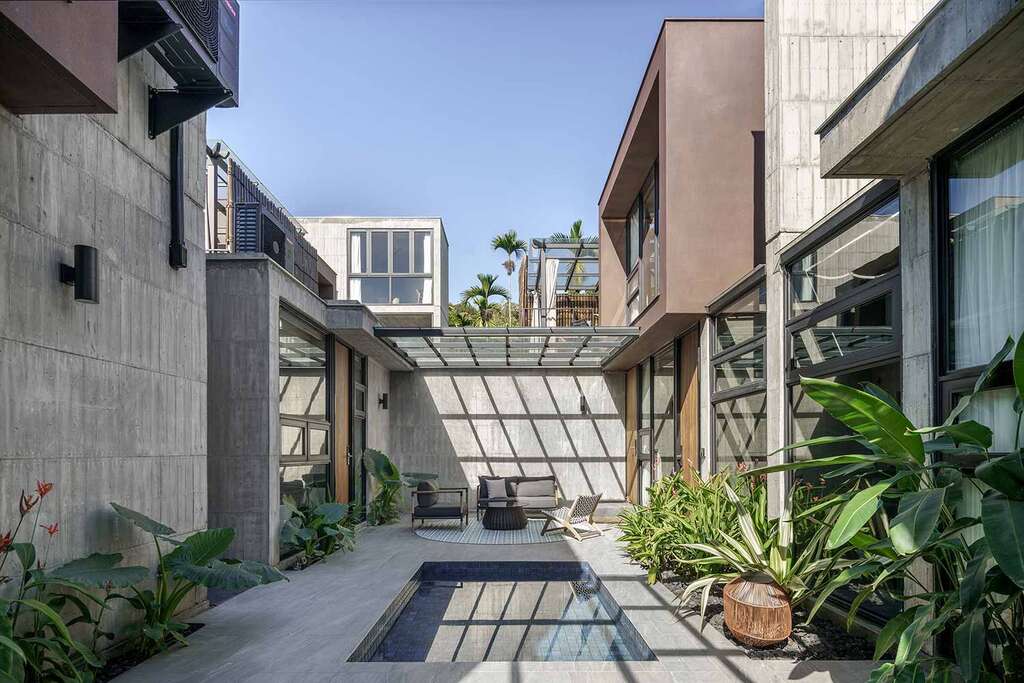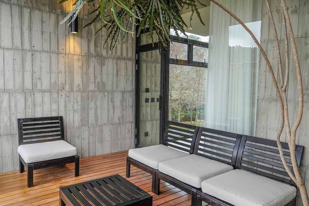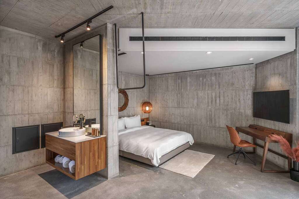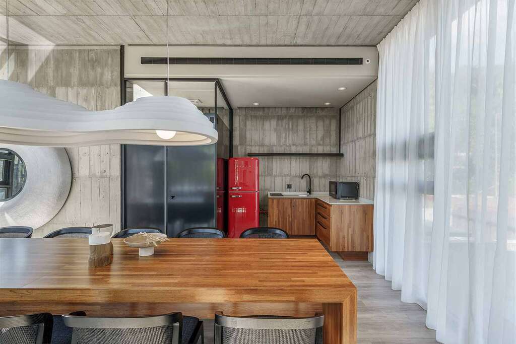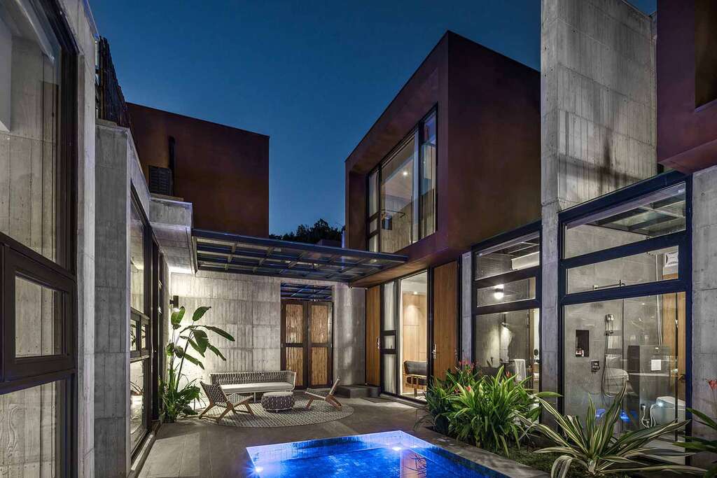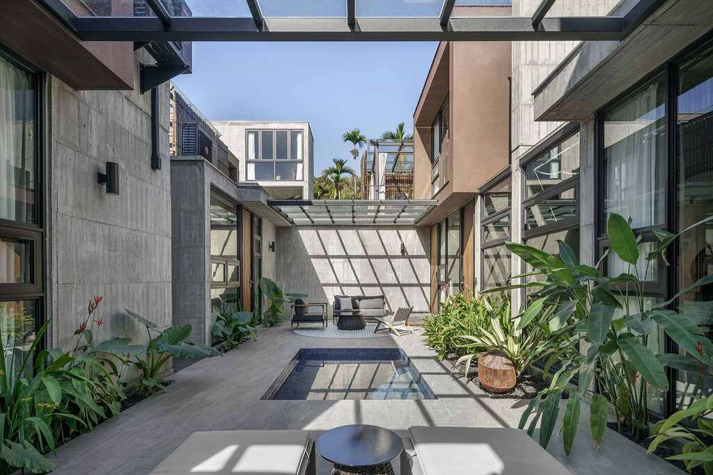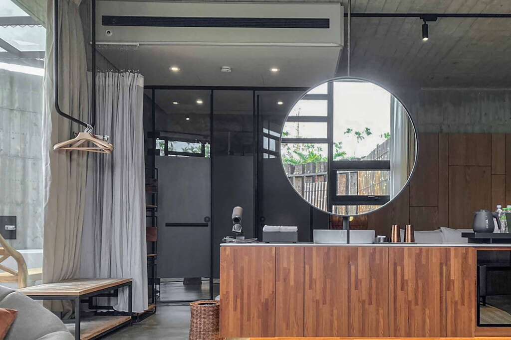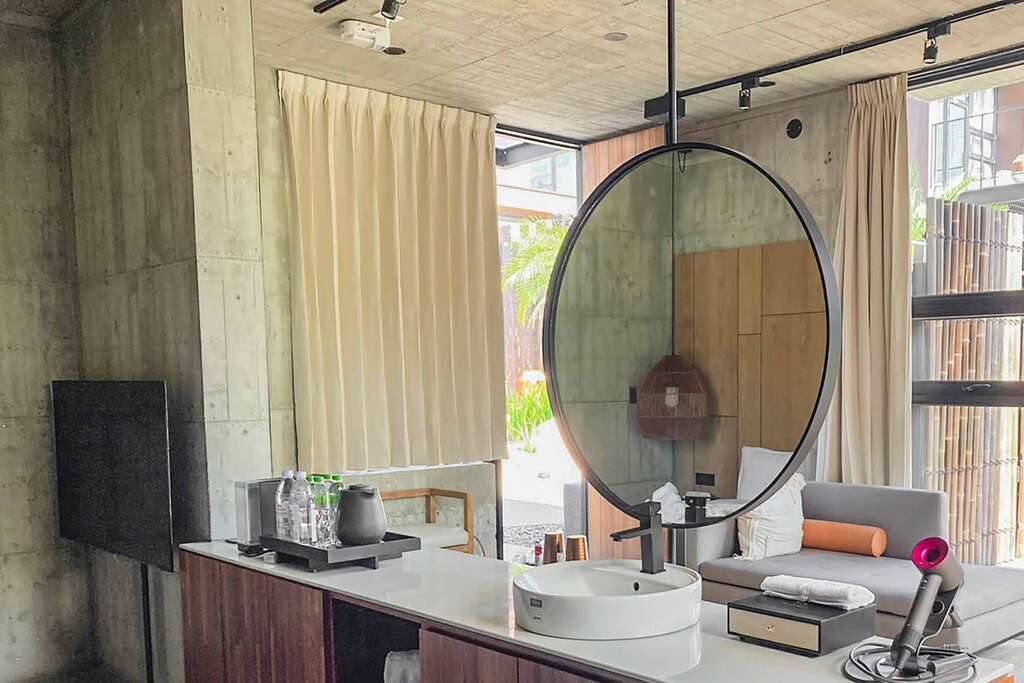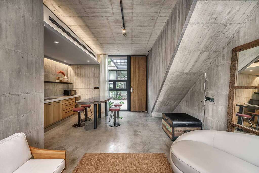 水的創意延伸至馬賽屋的共院,包區的旅人形成聚落,圍繞水池,隨性散坐,水池特別設計40公分高,營造無壓力的輕鬆感,靜水如鏡,能夠洗滌煩憂,拉近人們的距離,彼此聊天說笑,在天光與星空下,收藏相聚回憶。
