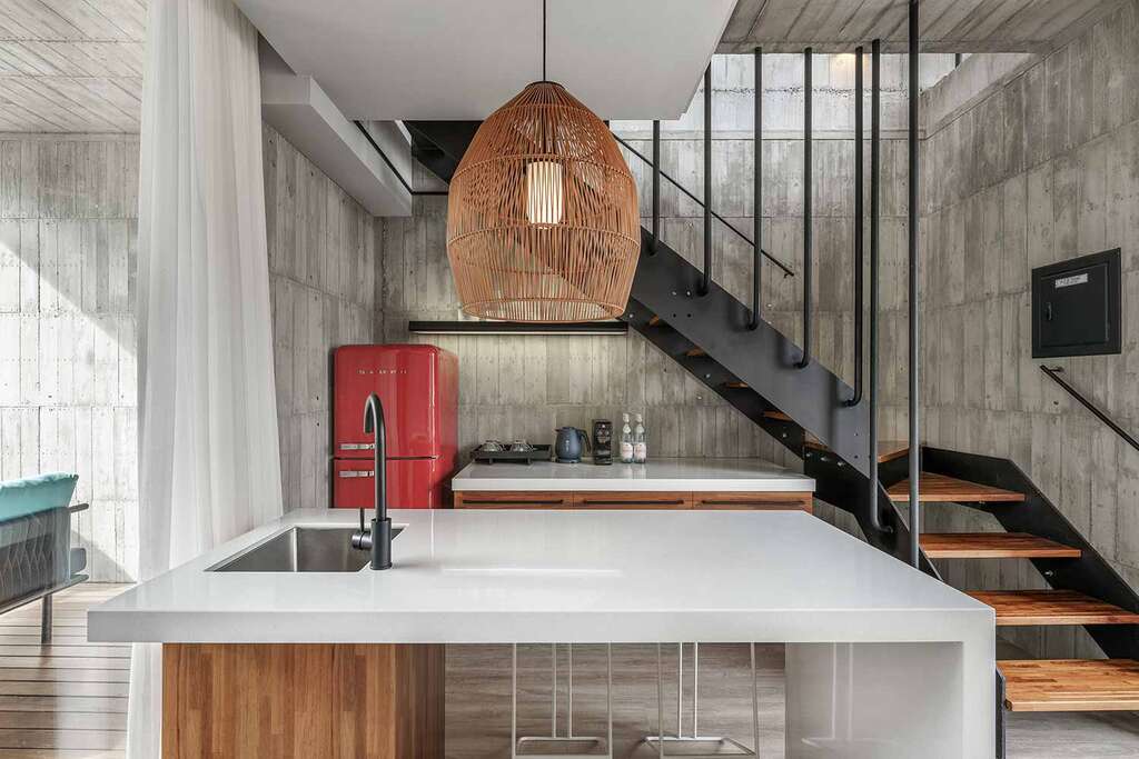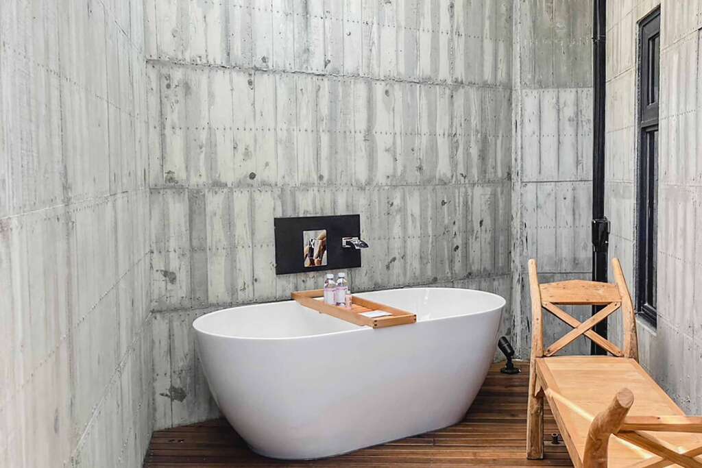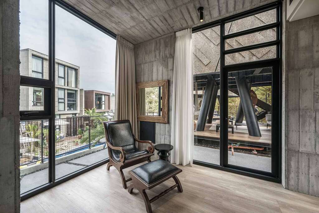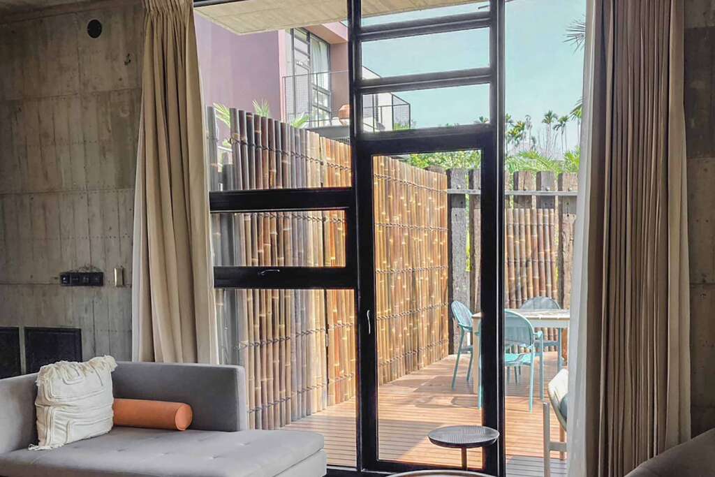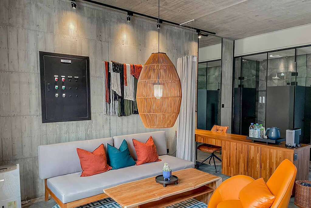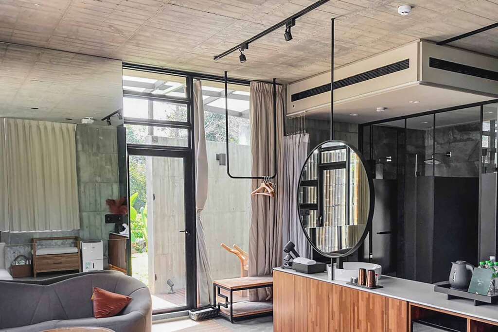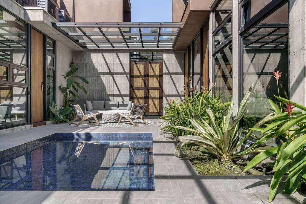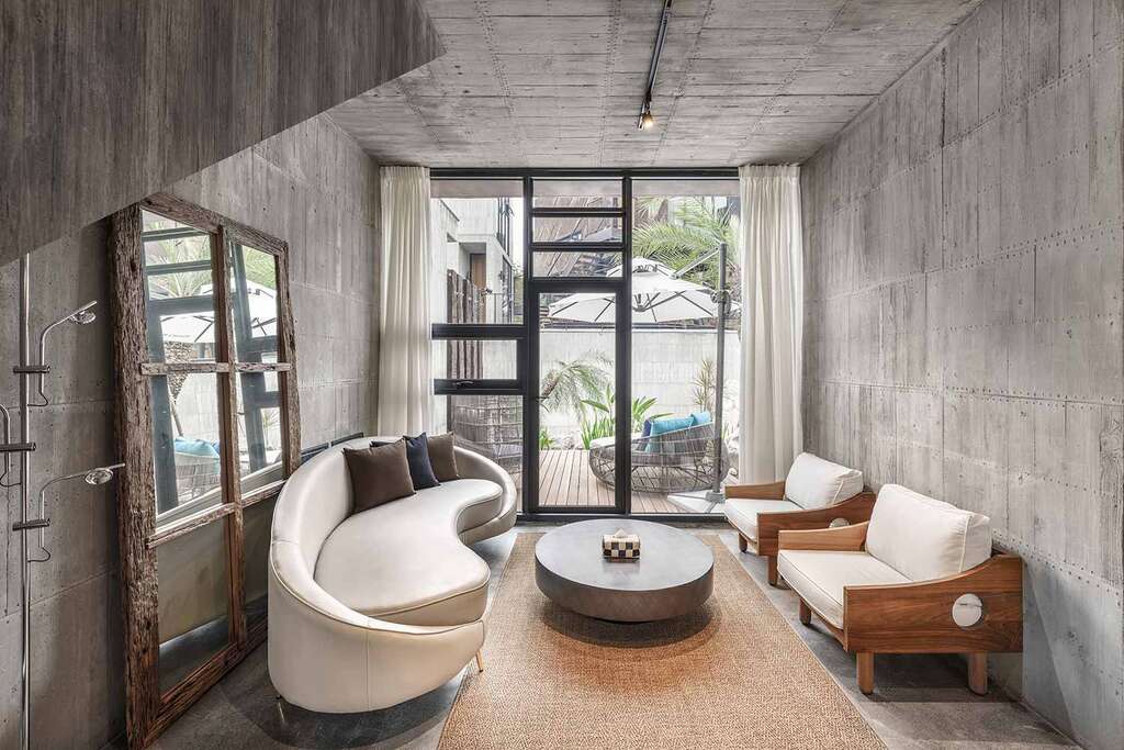 水的創意延伸至馬賽屋的共院,包區的旅人形成聚落,圍繞水池,隨性散坐,水池特別設計40公分高,營造無壓力的輕鬆感,靜水如鏡,能夠洗滌煩憂,拉近人們的距離,彼此聊天說笑,在天光與星空下,收藏相聚回憶。