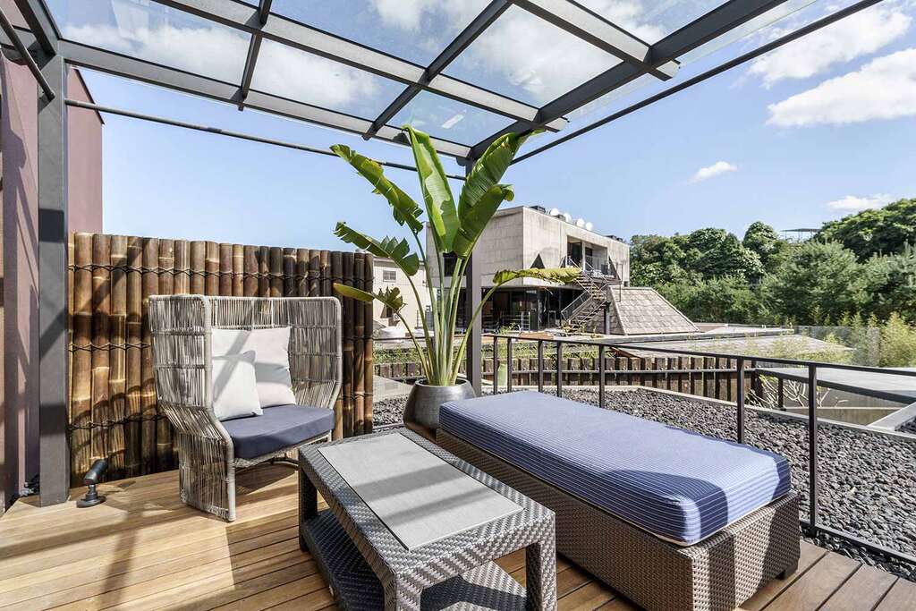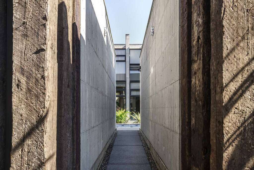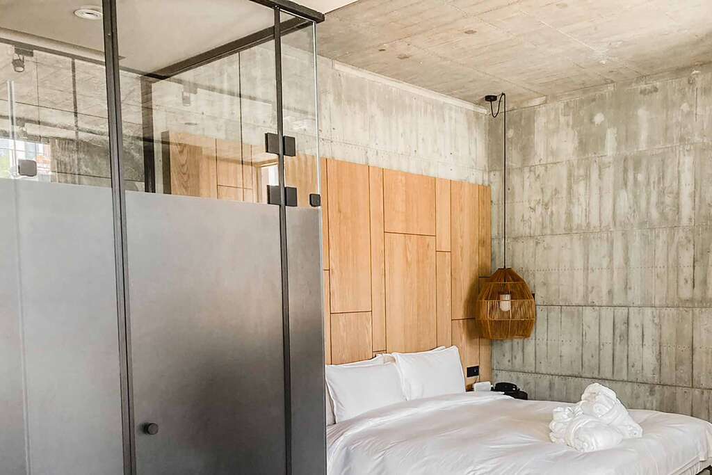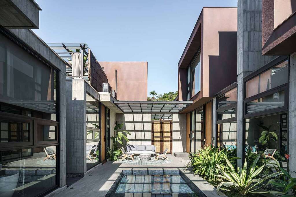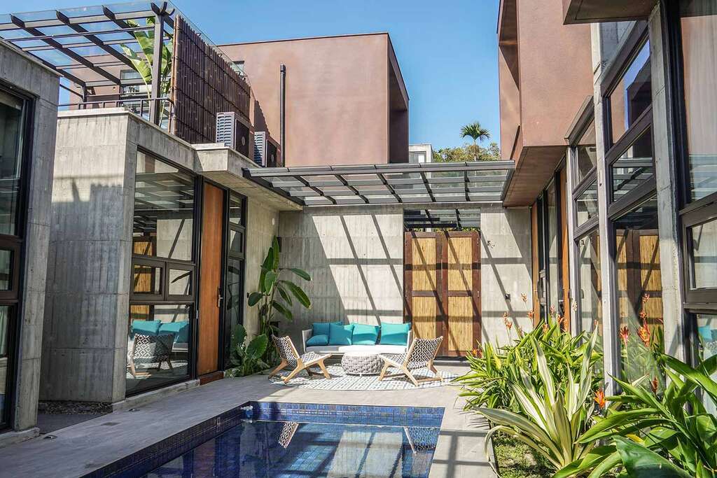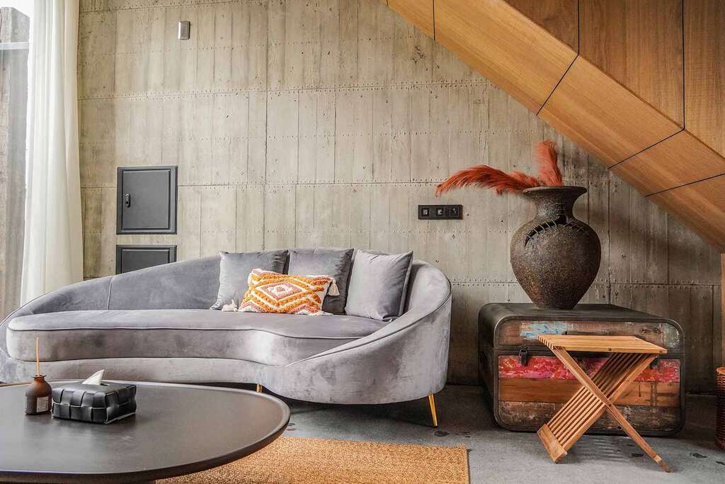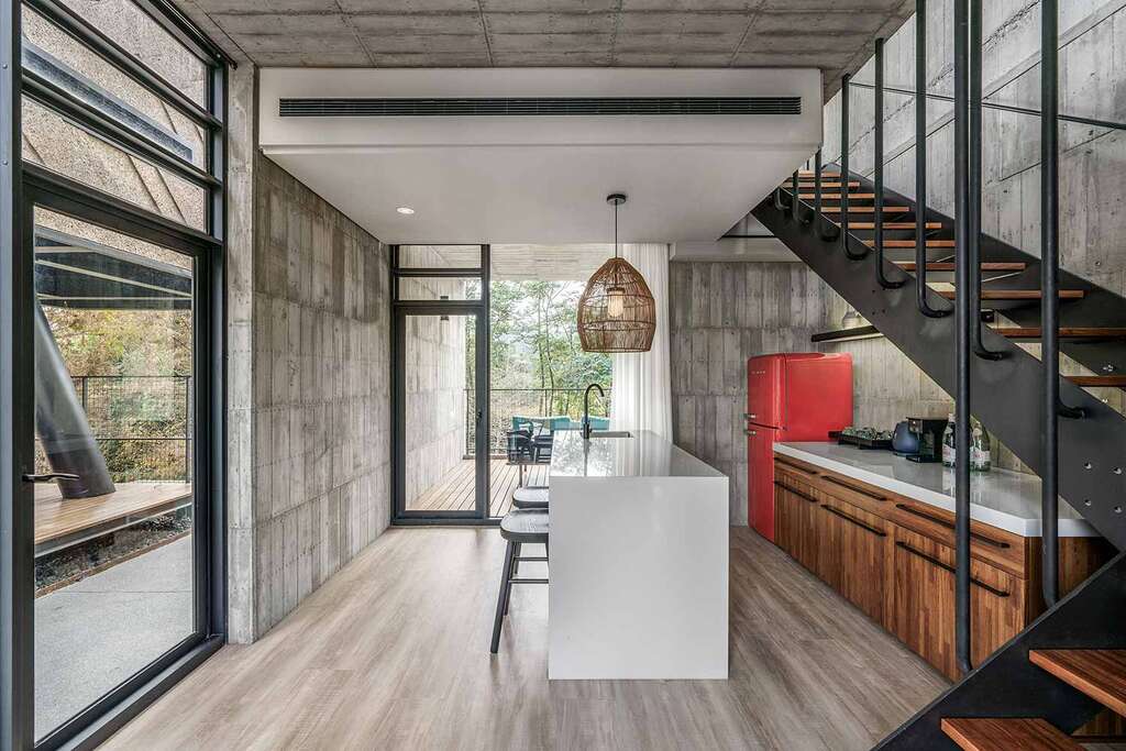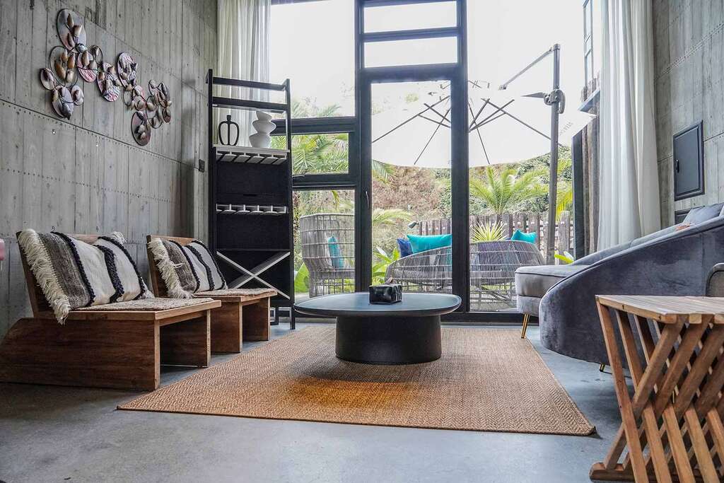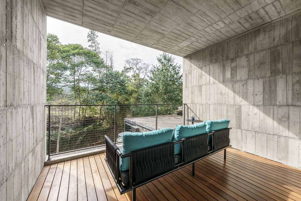 水的創意延伸至馬賽屋的共院,包區的旅人形成聚落,圍繞水池,隨性散坐,水池特別設計40公分高,營造無壓力的輕鬆感,靜水如鏡,能夠洗滌煩憂,拉近人們的距離,彼此聊天說笑,在天光與星空下,收藏相聚回憶。