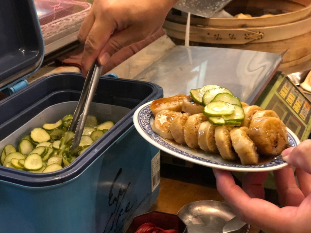 香菇糯米肥腸,與一般糯米腸不同的是老闆在灌米腸前,會先將內餡裡的豬肉、香菇和油蔥下去炒香,讓古早味的糯米腸增加更多的層次感,品嘗時搭配特製醬汁與老闆親自醃漬的酸甜小黃瓜,無論米腸本身的扎實地嚼勁,還是那撐滿回憶的味道,都是絕美的搭配!