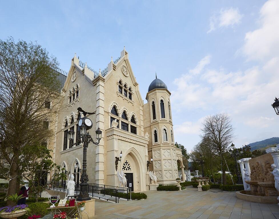 城堡主人在清境的巧克力工坊屬歐洲童話風,因此延續歐洲元素,起初想法單純就是孩子們最喜歡城堡,最後比照真實城堡的超高規格打造,使用頂級石材建造展現磅礡氣勢。