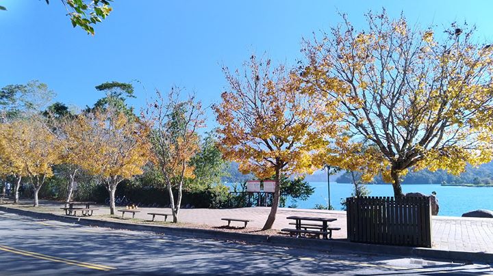從日月潭入口右轉往向山公園方向幾公里的湖畔,每年10月至12月黃金楓逐漸轉成金黃色,以11月是最佳觀賞期。還有太陽花與湖光山色輝映如詩畫美幻,情侶騎單車遊賞,饒富秋詩翩翩。騎到向山公園賞金黃落羽松,之後,再往十幾公里遠的水里鄉車埕,繼續欣賞落羽松和楓紅,為金秋譜出浪漫情懷~不用花錢出國也能圓夢
