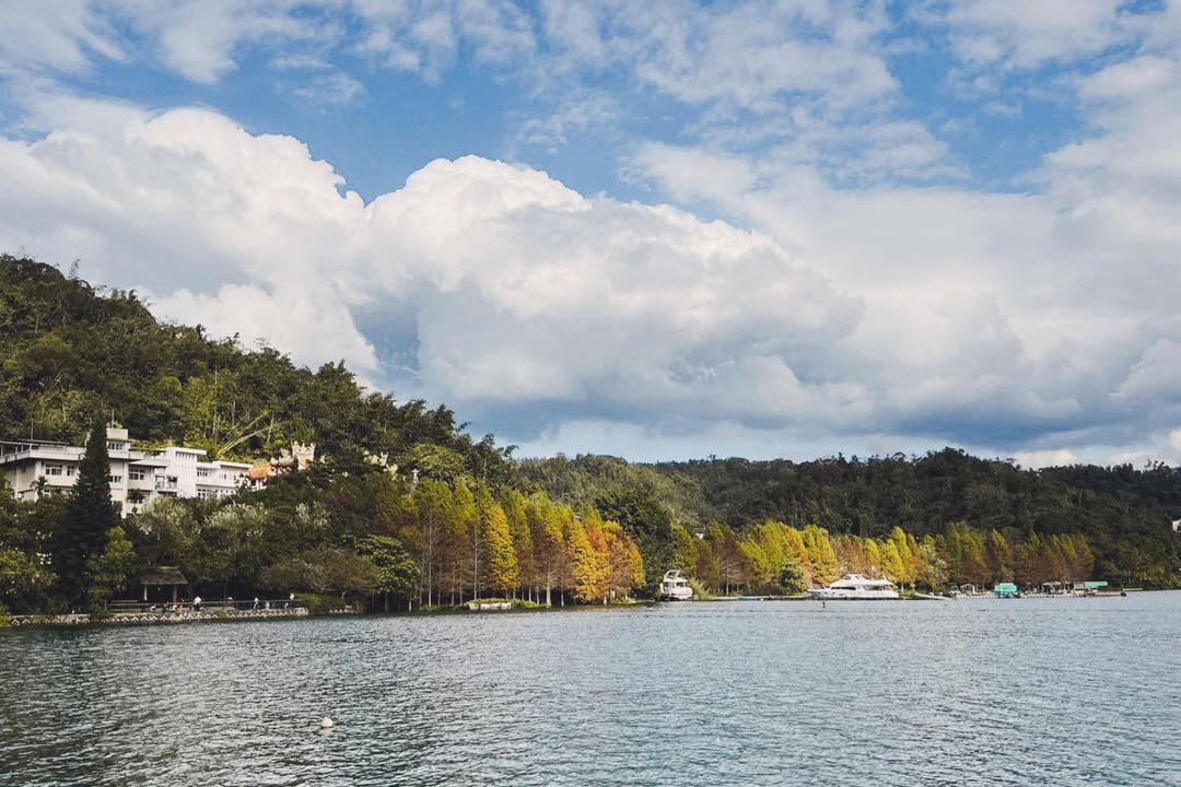 在水社最美自行車道上的落羽松 轉紅更明顯🍂