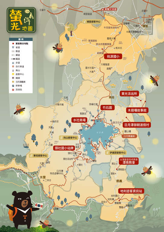日月潭自然生態資源豐富,每年4至5月在桃米、東光、大林、水社、頭社、潭南及丹大等七大賞螢據點,可欣賞到黃緣螢、黑翅螢、大端黑螢、梭德氏脈翅螢等螢火蟲在星空下飛舞的浪漫美景。
