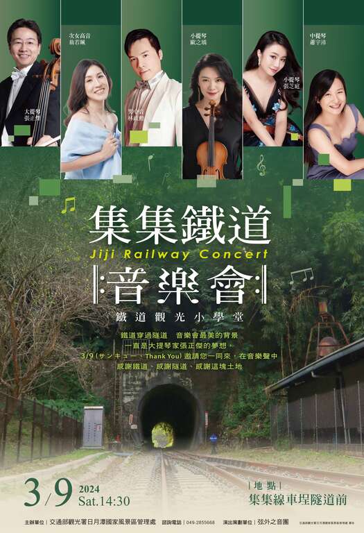 【集集鐵道音樂會】訂於113年的3月9日(星期六)下午2時30分,在車埕火車站附近的隧道口舉行,由大提琴家張正傑領軍,率領弦樂四重奏與兩位聲樂家,將台灣豐富的鐵道歷史與音樂藝術相結合,以西洋古典音樂的形式來敘述台灣這塊土地,帶著聽眾一起浸淫在思鄉愛家的氛圍、穿梭於離散又聚合的生命故事中。