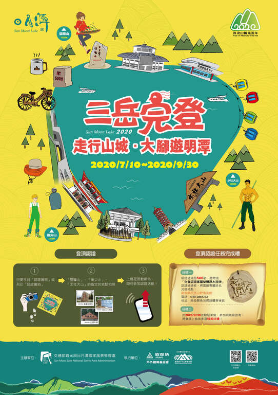 選出猫囒山、頭社後尖山、水社大山三座登山步道,只要登頂其中任何兩座山,並上傳照片就可以獲得日月潭限定「完登認證專屬榮譽原木掛牌」,同時在登山步道途中也有「尋找大自然尋寶活動」,與生態拍照小卡拍照,並上傳照片可以參加週週抽「明潭三岳AR名信片套組」,集滿15個拍照點,每月前5名還可獲得「明潭三岳紀念登山杯+AR名信片套組」,為您遊訪日月潭留下美好回憶!