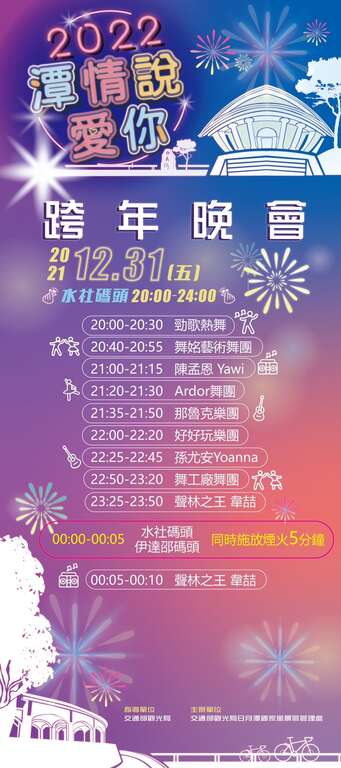 🔹煙火施放:111年1月1日 午夜00:00 水社碼頭、伊達邵碼頭同時施放300秒絢麗花火