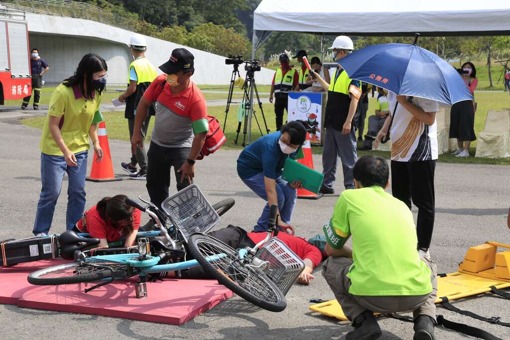 日月潭國家風景區管理處 簡慶發處長表示,近年自行車活動越來越熱絡,觀光局規劃許多風景區的自行車路線,為強化本處針對自行車活動之緊急應變機制,今年特別將自行車意外狀況規劃於向山遊客中心辦理大型活動安全演練;非常感謝南投縣政府消防局第二大隊日月潭分隊給予本處支援,而本處同仁展現精實的演練及彼此間良好的默契與應變,讓緊急通報及災害搶救程序順暢、確實,演練活動也圓滿順利完成。