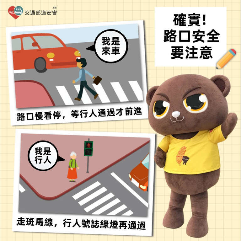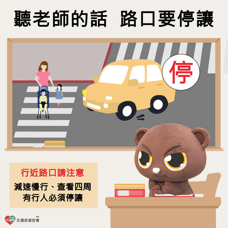 1.車輛行近路口有行人穿越,務必「停車」讓行人先行。車輛要慢看停,慢-路口放慢速度,看-注意周遭人車,停-停讓行人通過。