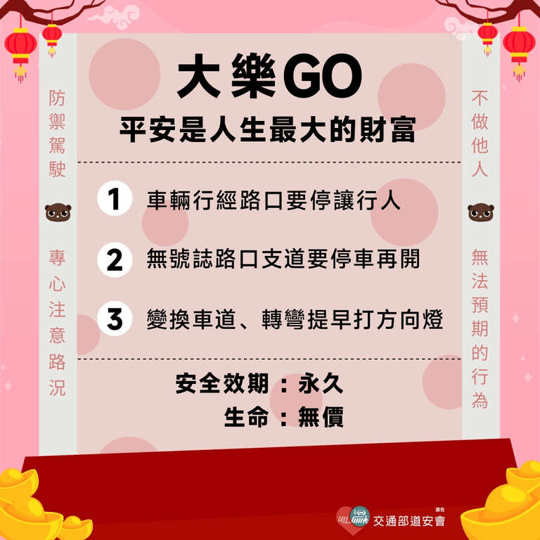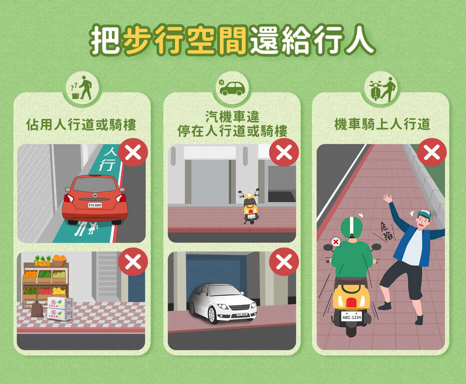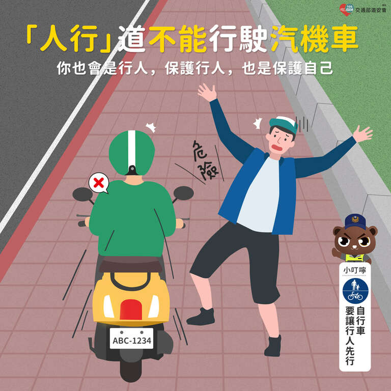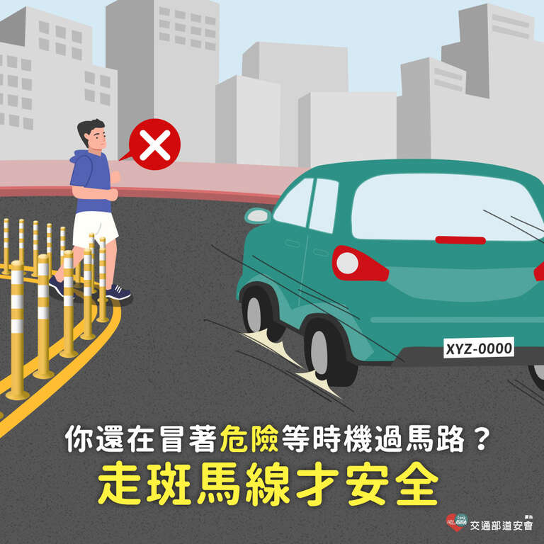 2.行人勿在路段中違規穿越道路,請走行人穿越道,不滑手機。行人停看聽,停-在安全地點停等,看-過馬路盯住來車,聽-注意車輛警示音。