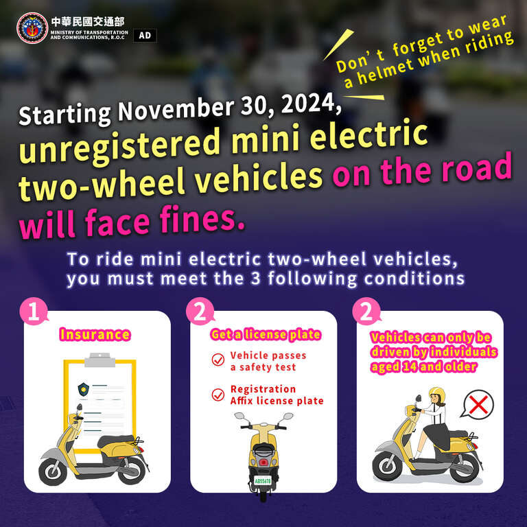 按道路交通管理處罰條例規定,微型電動二輪車自113年11月30日起未完成掛牌程序逕上路係屬違規,請使用微型電動二輪車應於113年11月29日前完成掛牌事宜。