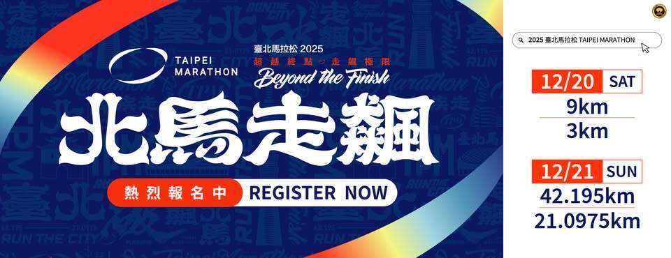 訊息內容 由臺北市政府、中華民國田徑協會及中華民國路跑協會共同主辦,市府體育局承辦,為市府年度重要大型活動,訂於114年12月21日上午6時30分假臺北市政府市民廣場起跑,終點設置於臺北田徑場,約2萬8,000名跑者參賽。 馬拉松組登記報名時間自7月15日下午4時至7月28日下午5時;半程馬拉松自8月8日下午4時至8月20日下午5時,兩組皆採抽籤制,報名訊息請點此處。 相關照片 上一則 回列表 下一則