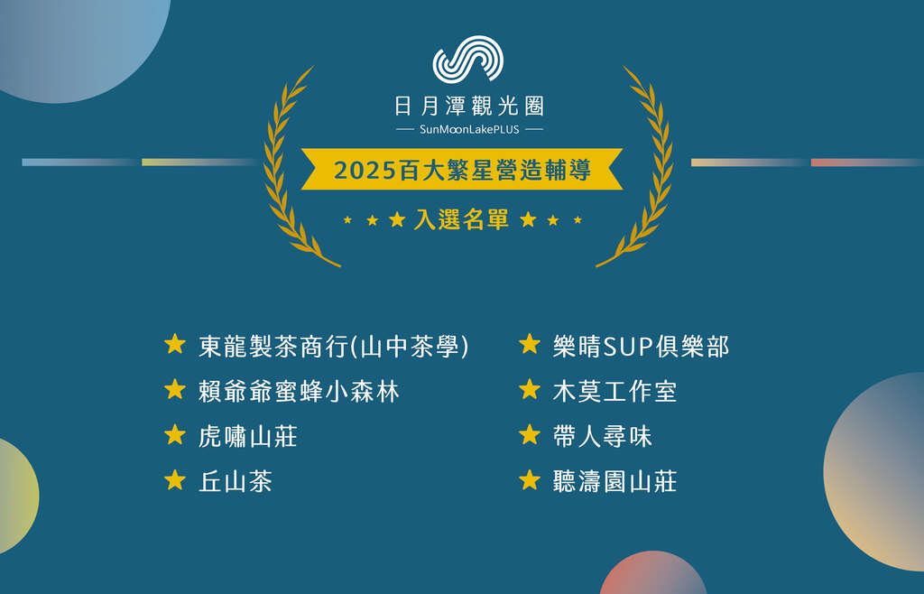 訊息內容 日月潭觀光圈百大繁星營造輔導計畫,經過兩階段的書面審查與實地訪視,以及遴選委員會的綜合評議,最終選出 8 個單位榮獲「百大繁星」殊榮。 今年度獲選場域皆符合計畫宗旨、具備公共性,並能透過本計畫的輔導,進一步提升吸引力與競爭力。感謝所有參與申請的夥伴付出的努力,也恭喜所有獲選單位! 相關照片 上一則 回列表 下一則